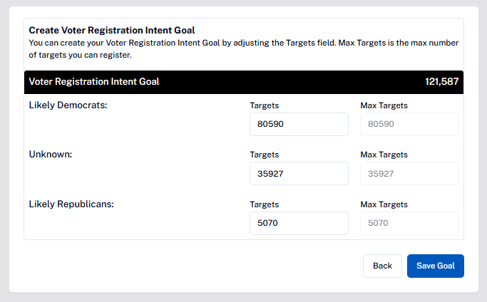 - If the count of available unregistered targets increases due to a data refresh, the aced goal will not automatically change. The update maximum targets will appear when editing the Registration Intent Goal.