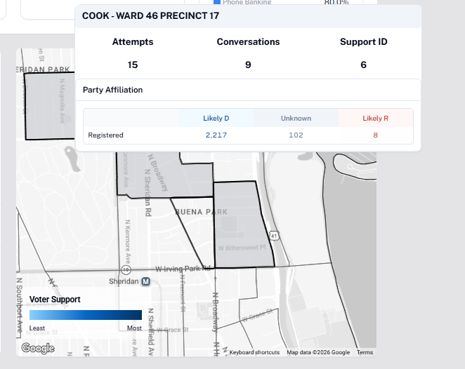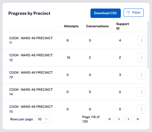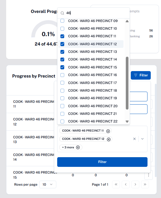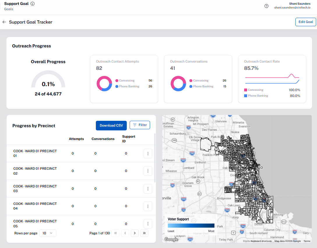 - The tracking page displays progress towards the overall goal broken out by precinct
