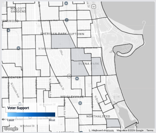 Precinct shading reflects the contribution toward the overall campaign goal, rather than the precinct size. A 10% or greater contribution will be shaded at maximum intensity. A 0% contribution will appear unshaded.