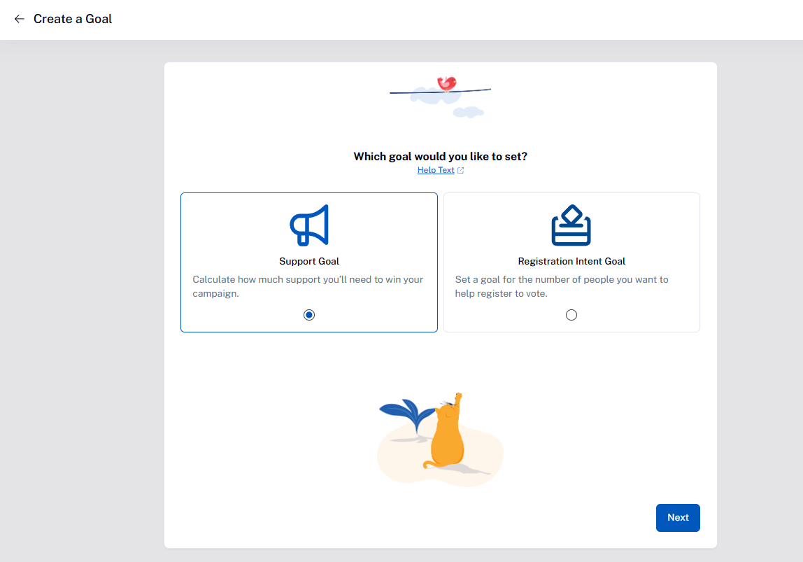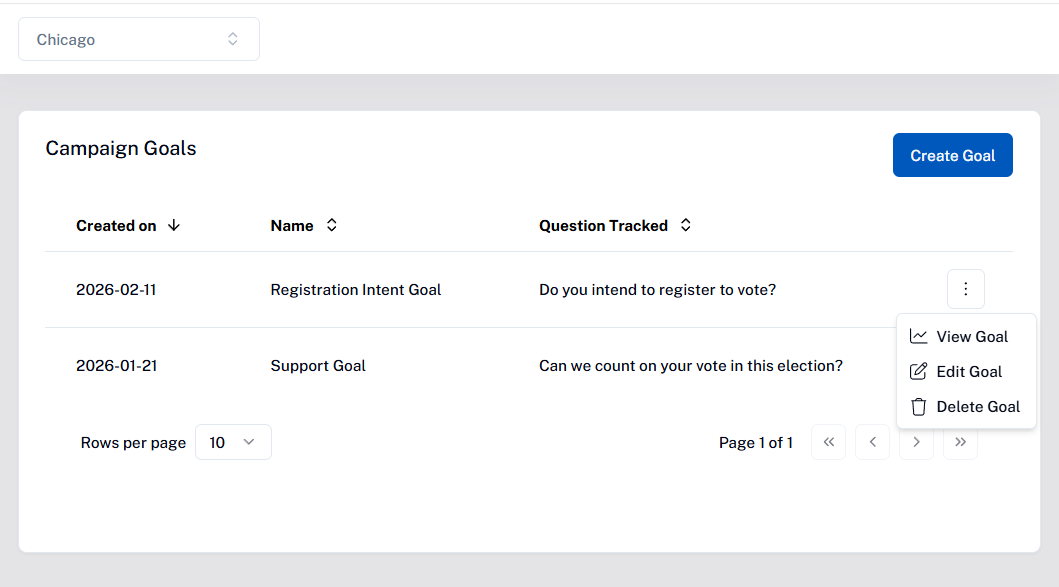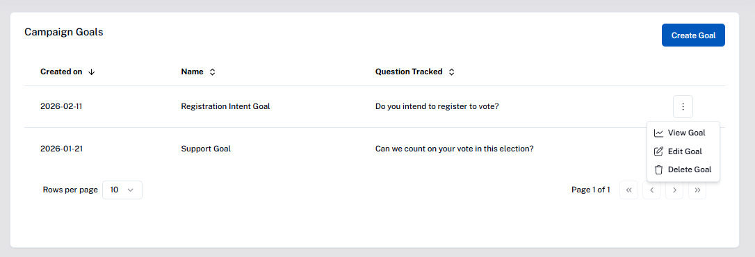 The Goals page allows you to set, track, and manage measurable campaign goals tied to the standard survey questions (support score and registration intent questions.) In the future, the support goals may account for custom survey question responses.
