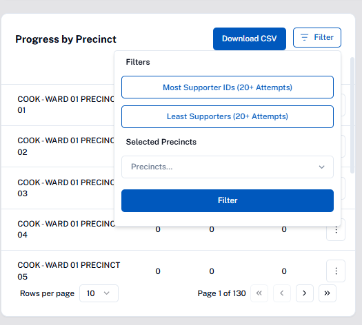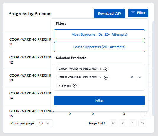 - If a filter is applied, downloads include all voters within selected precincts that are relevant to the goal type, not just those with positive IDs.