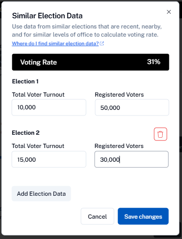 Clicking this button opens a modal that helps you adjust your turnout calculation by guiding you through how to look up historical election data.