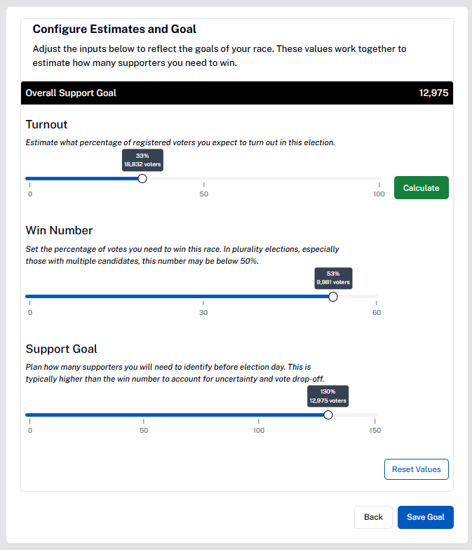 Clicking Save changes will close the modal and apply the calculated Voting Rate to the Turnout Goal on the Support Goal configuration page.