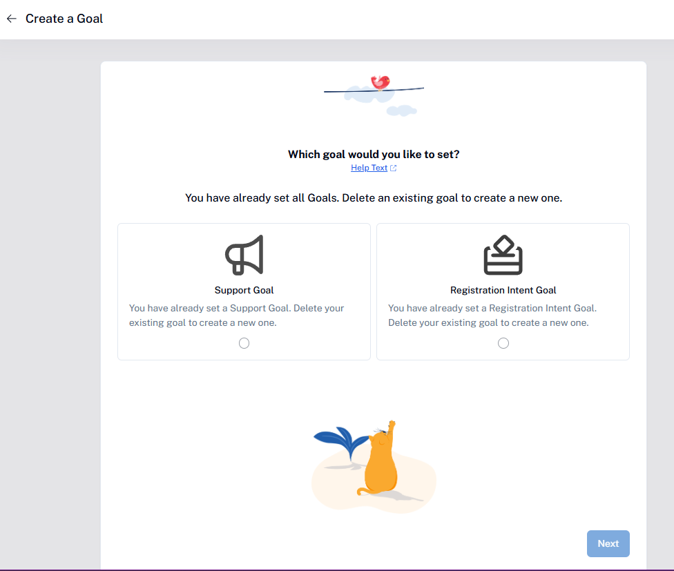 - You may only have one Support Goal and one Registration Intent Goal at a time