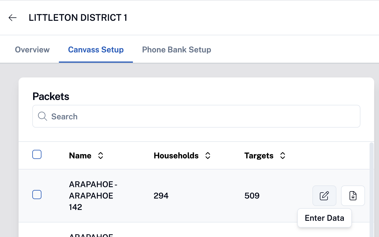 - Access the data entry interface by going to Programs > Canvass Setup > Finding the packet you want to enter data for and clicking on the pencil icon (enter data icon)